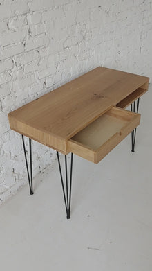 Der Karl-Schreibtisch ist ein elegantes Büromöbelstück aus europäischer massiver Eiche mit eleganten Metallbeinen. Mit einer geräumigen Tischplatte und zwei Schubladen bietet er reichlich Stauraum.