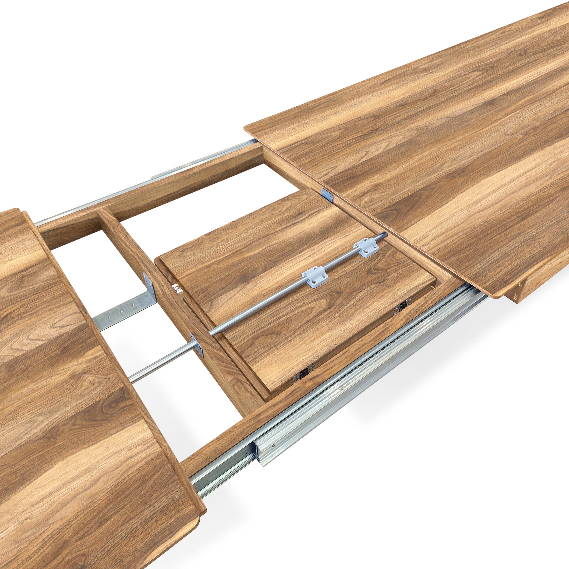 Der ausziehbare Tisch verfügt über eine zusätzliche Platte, die den Tisch um drei weitere Sitzplätze erweitert. Die Verlängerungen werden im Tisch verstaut.