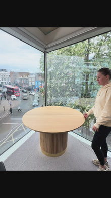 Dieser runde Tisch verfügt über eine Tischplatte aus Massivholz oder gebeiztem Eichenfurnier. Der beschwerte Sockel ist mit vertikal ausgerichteten, gebeizten Eichenpaneelen ausgestattet.