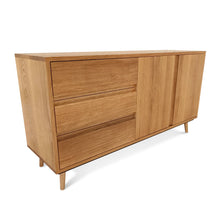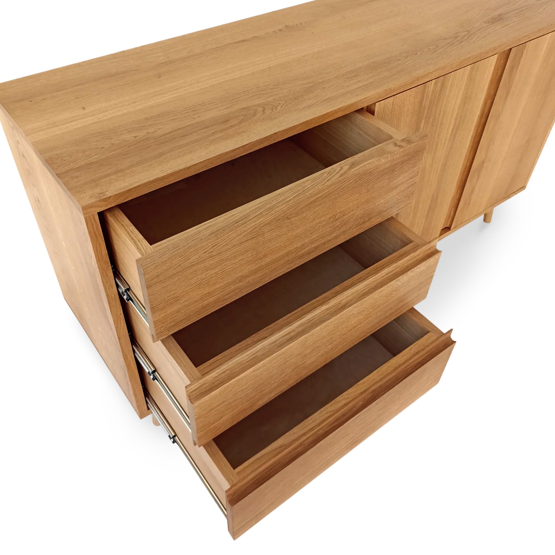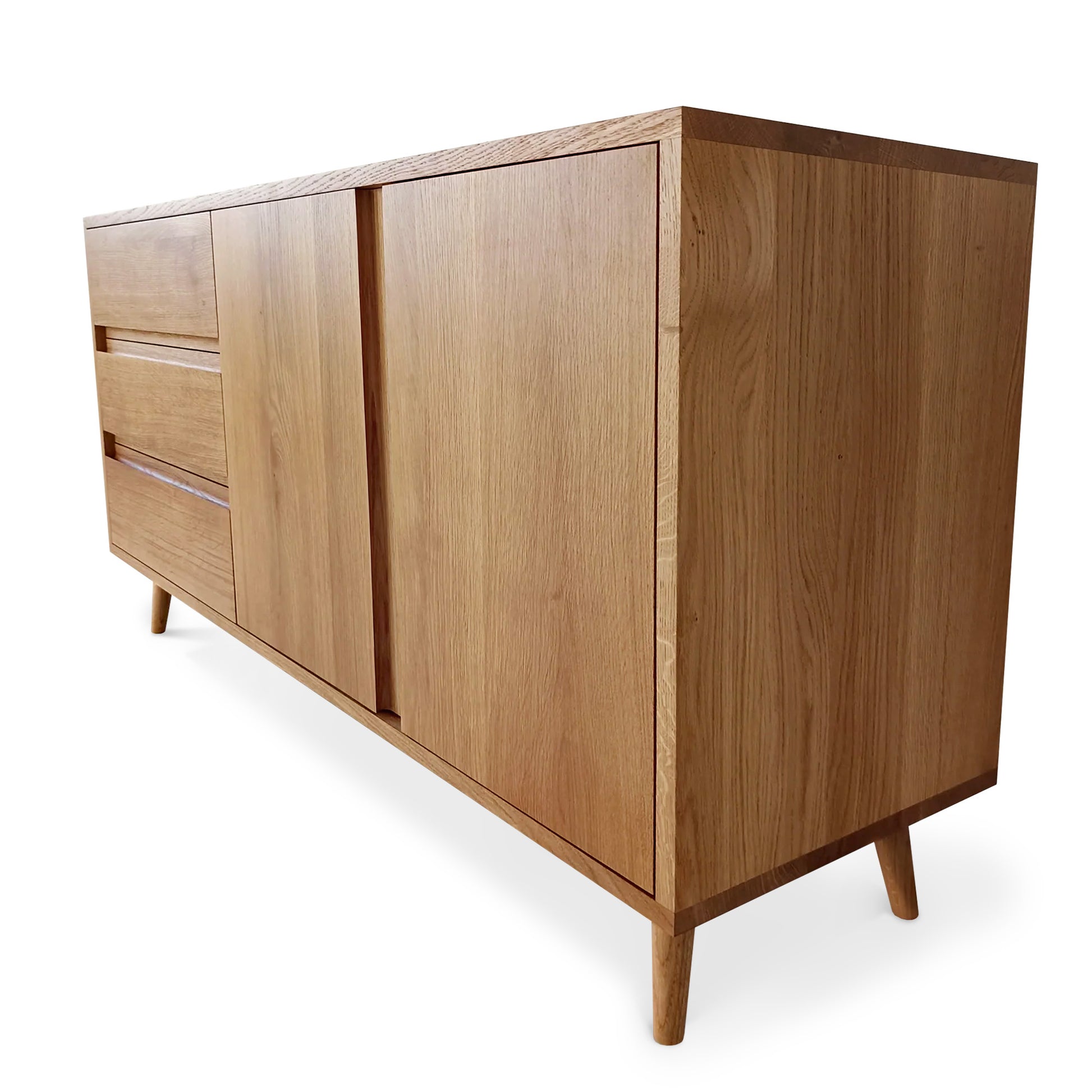 Das Celine Sideboard ist ein wunderschön gefertigtes Stück aus massivem Eichenholz. Es ist in fünf Standardgrößen erhältlich (von 100x45x75 cm bis 180x45x75 cm), und die Oberfläche ist mit Hartwachsöl behandelt, um Langlebigkeit zu gewährleisten. Die Metallteile sind mit Pulverbeschichtung versehen, um eine lange Lebensdauer zu sichern. Für diejenigen, die eine einzigartige Passform suchen, sind auch Sondergrößen verfügbar. Diese Kommode kombiniert zeitloses Design mit Praktikabilität und bietet sowohl ästhetischen Reiz als auch reichlich Stauraum.