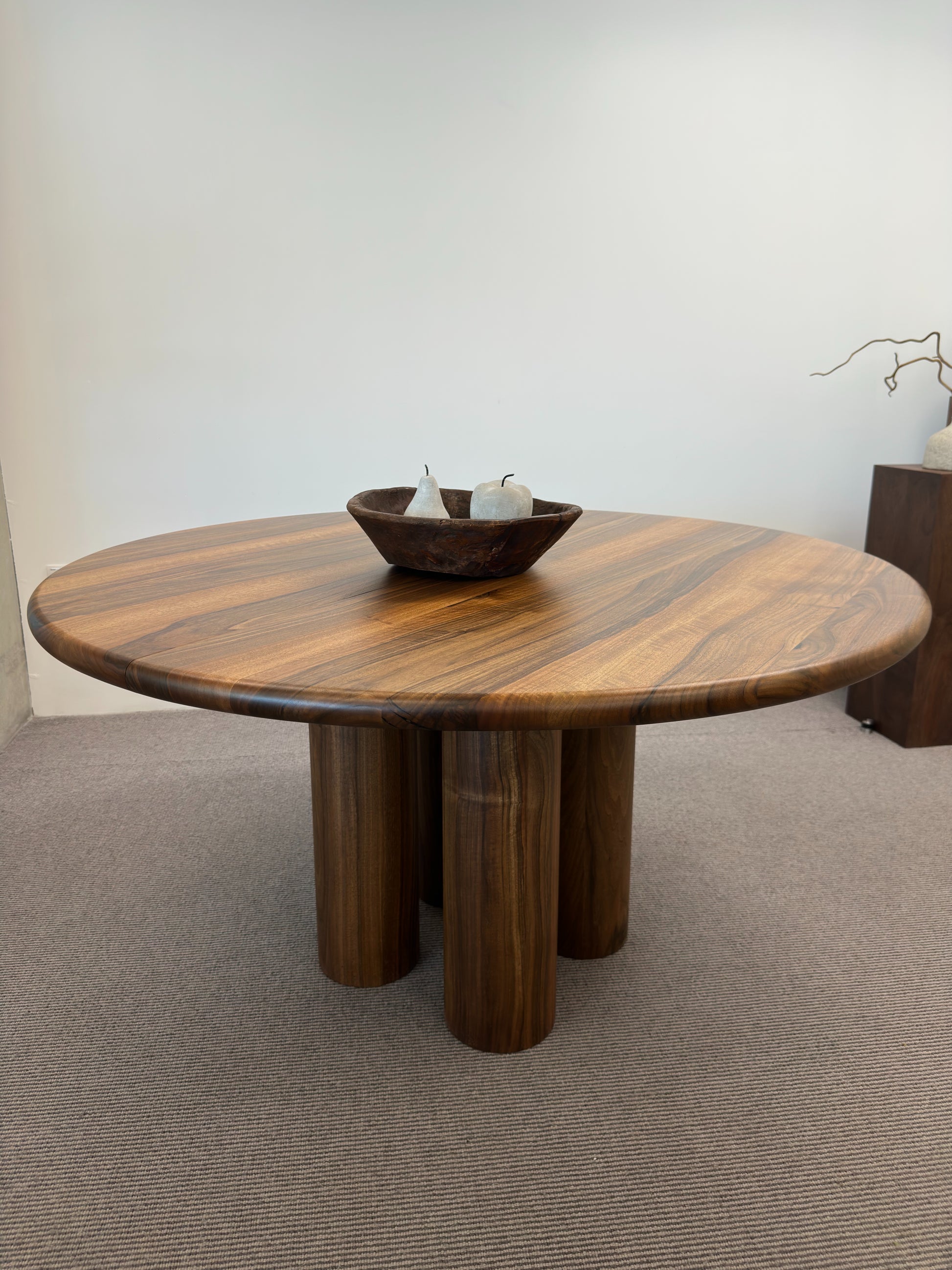 Dieser luxuriöse runde Esstisch, fachmännisch aus hochwertigem massivem europäischem Walnussholz (dunklerer Farbton von 708+3062 Osmo) handgefertigt, verkörpert Eleganz und Langlebigkeit. Entworfen, um der Mittelpunkt jedes Speisezimmers zu sein, vereint er ästhetische Anziehungskraft mit unvergleichlicher Qualität. Das Design dieses runden Esstisches fördert Zusammenkünfte und herzliche Gespräche, während die Holzbeine einen Hauch von Authentizität und Tradition einführen.