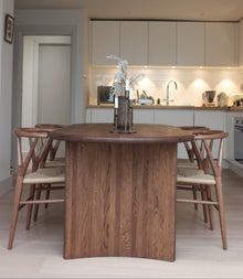Der Malvin Tisch besticht durch ein einzigartiges Design mit wunderschön geschwungenen Basen an den Seiten, die vollständig aus massivem Nussbaumholz gefertigt sind. Die Tischplatte präsentiert eine elegante Kantenverarbeitung, die sanft nach unten abfällt und jedem Ambiente einen Hauch von Raffinesse verleiht. Erhältlich in verschiedenen Größen, kann der Malvin Tisch auch individuell nach Ihren spezifischen Anforderungen gefertigt werden.