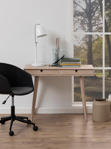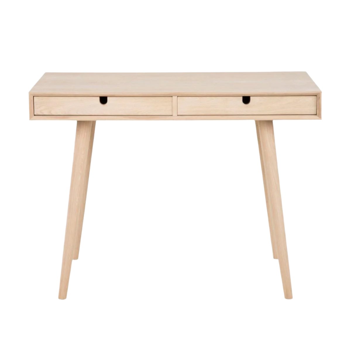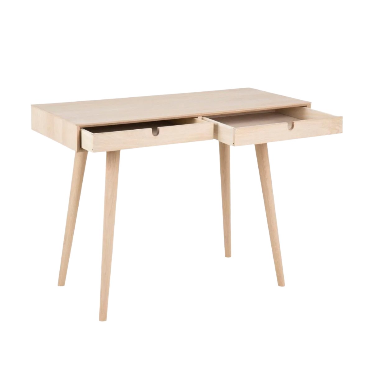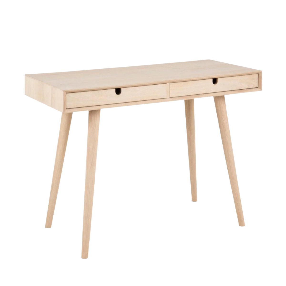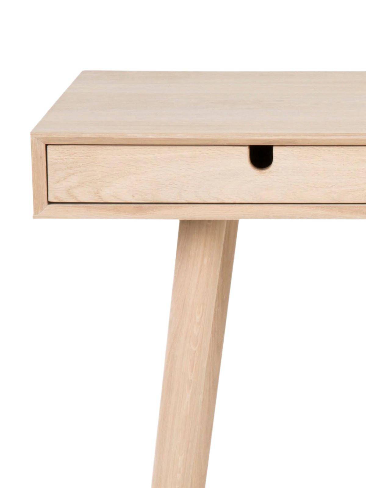 Calvin Desk, ein Bürostück im Vintage-Stil, gefertigt aus wunderschönem massivem Eichenholz. Es bietet reichlich Stauraum, eine geräumige Tischplatte und zwei Schubladen.