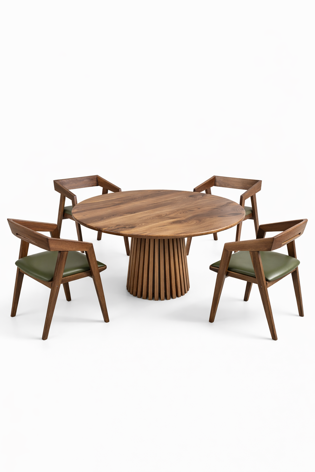Einführung unseres handgefertigten runden Esstischs in Walnuss mit Pfeifenbeinen - eine atemberaubende Ergänzung zu jedem Zuhause. Dieser Tisch aus massivem Holz kombiniert Eleganz und Funktionalität. Mit der ausziehbaren Funktion können Sie die Größe einfach für zusätzliche Gäste anpassen und sie perfekt für die Ausrichtung von Dinnerpartys und besonderen Anlässen eignen.