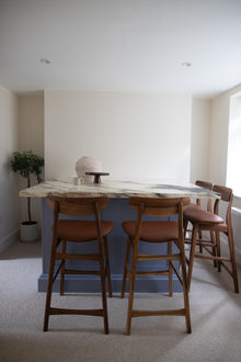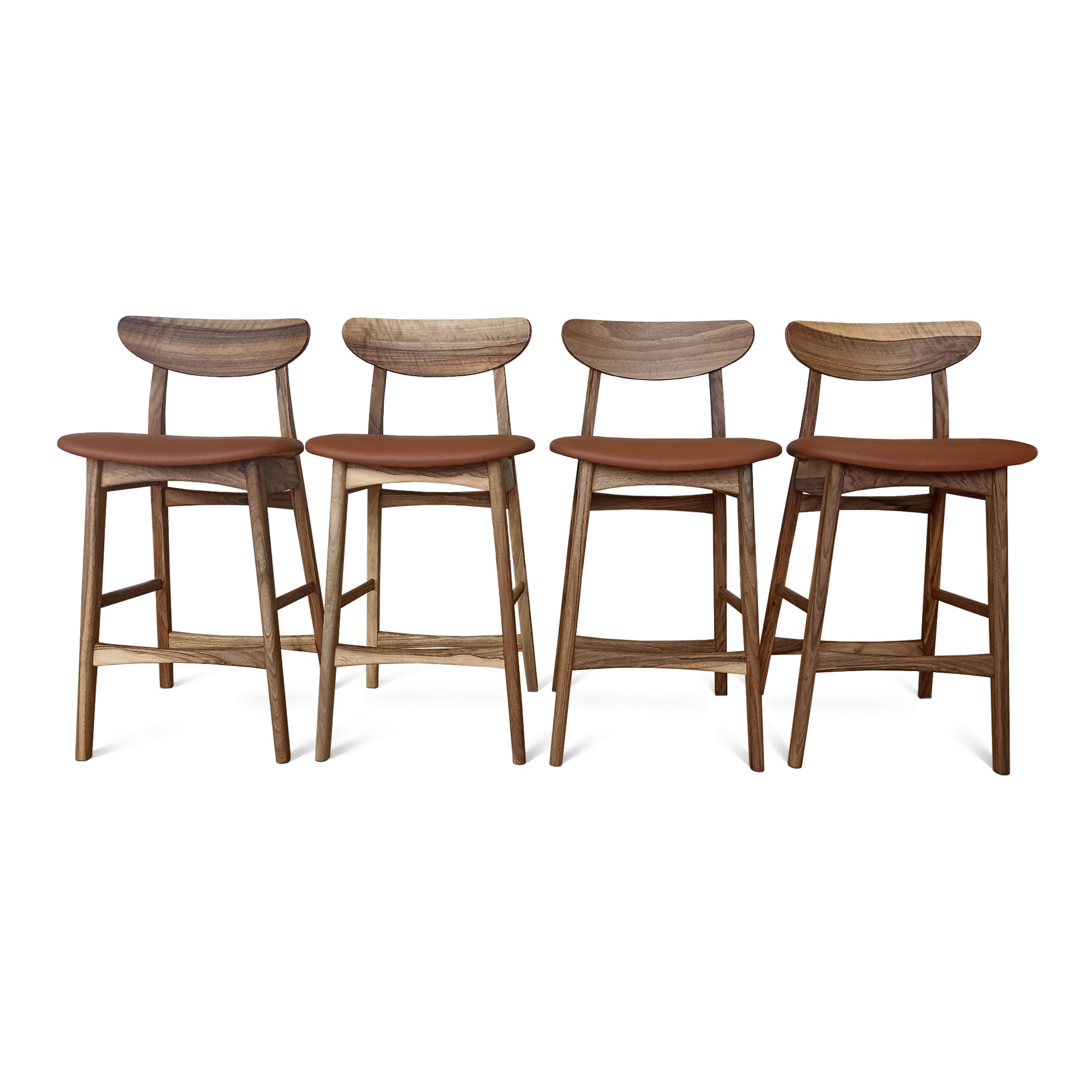 Handcrafted from natural walnut, this elegant stool features a seat upholstered in cognac leather for a timeless look. The frame is finished with Rubio Monocoat two-component wood oil for lasting durability and wear resistance. A 30 mm foam lining ensures excellent sitting comfort. Seat height: 86 cm. Currently 4 in stock.